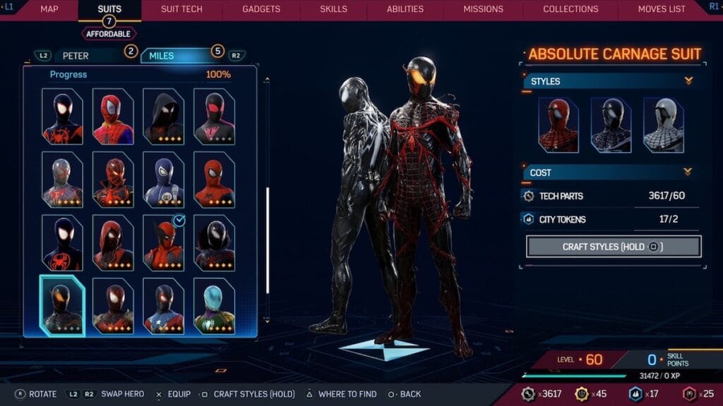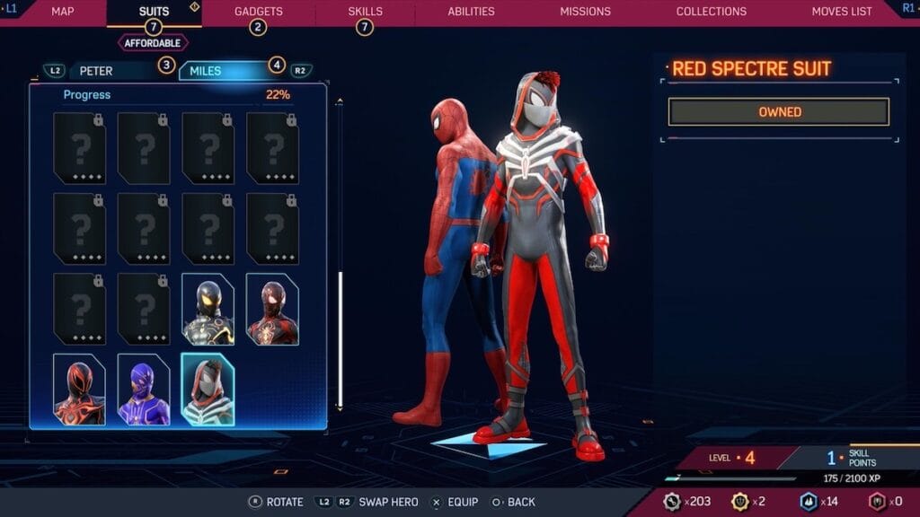 It feels appropriate that the best looking Miles suit in Spider-Man 2 is one design to look like a Symbiote given the focus on Venom in the game. This one is design to have a Carnage flair, which is shown through little bits of Symbiote sprouting around Miles in this suit. It also keeps the red and black design, with an excellent spider logo and nice detailing across the suit. It also doesn’t have any weird pieces sticking out, so there really isn’t anything to complain about here.