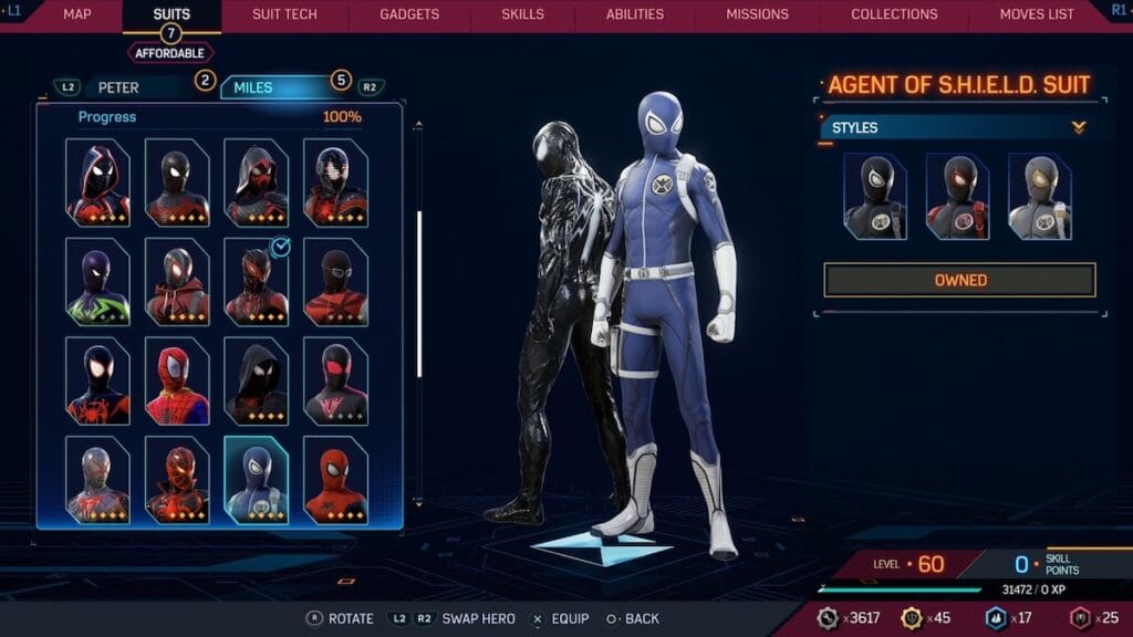 It’s always fun to see what Spider-Man’s suit would look like if he needed to fit in with a specific superhero team or organization. The Agent of S.H.I.E.L.D. suit imagines what Miles would look like if he joined the organization and needed a uniform. It features the light blue and white color scheme of S.H.I.E.L.D. while maintaining some of that classic Spider-Man look. You can also get a red and black version of this suit if it doesn’t have enough Miles for you.
