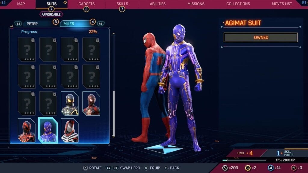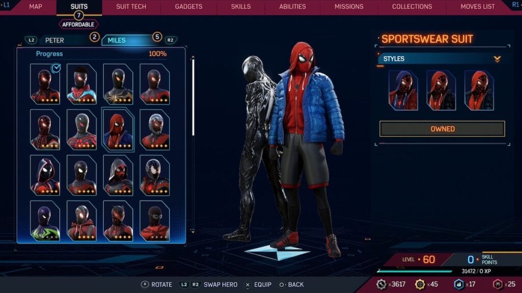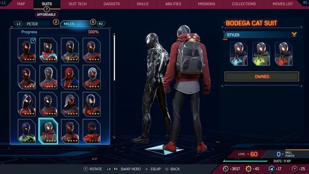 The Bodega Cat suit returns a fan favorite from Spider-Man: Miles Morales. This suit provides a winter look for Miles that still feels like Spider-Man, thanks to the large glowing spider logo on his hoodie. You get to see parts of his classic suit underneath, with the mask and legs poking out. His red shoes fit the suit very well and feel like a smart addition, not looking too out of place. Plus this skin features Spider-Cat in Miles’ backpack and who doesn’t love that?