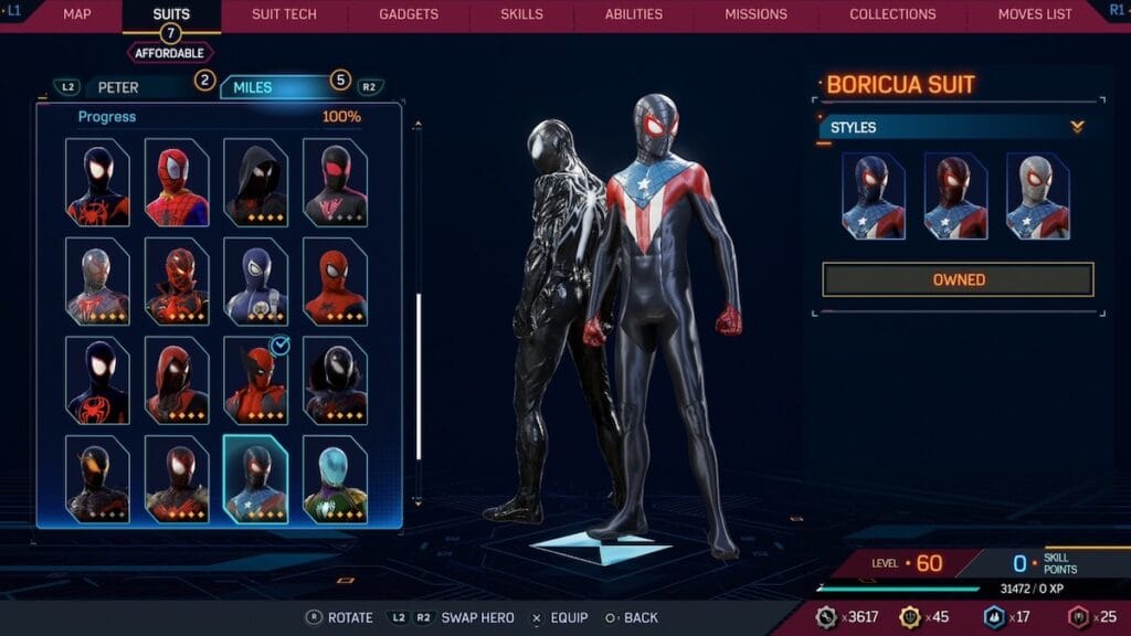 The Boricua suit is the main exception to the no red and blue for Miles, and for good reason. This suit takes the Classic design, but removes the spider logo in favor of incorporating the Puerto Rico flag into the suit. Insomniac Games has done a solid job of highlighting Miles’ Puerto Rican heritage in this series, so to have a suit that really puts it on display is a really nice touch. It also isn’t tacky, but limiting the flag to just the chest and not designing the entire suit around it.
