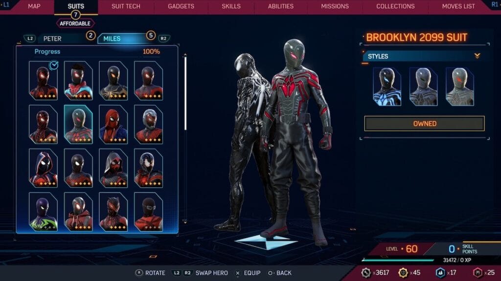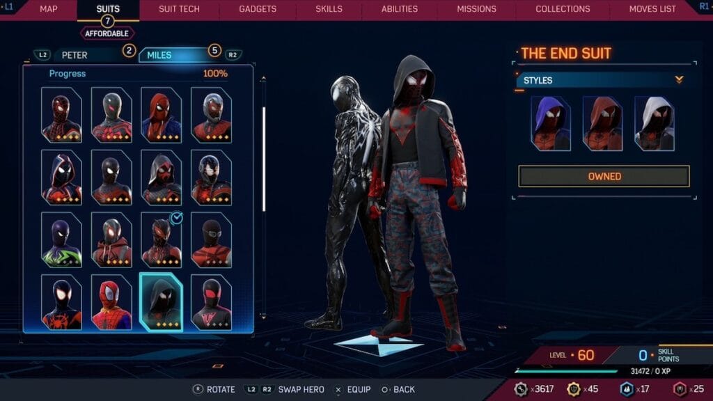 The Dark Ages suit feels like a Symbiote-inspired suit for Miles that mostly works. It has that shiny material look that Venom has, along with Miles’ classic red and black color scheme. It also has these curled eyes that feel like a more sinister looking version of the default Spider-Man mask eyes. This suit is held back by two things. First, it has a strange hood like material around Miles neck that just looks like excess material. Second, there is another similar suit that overall works better.