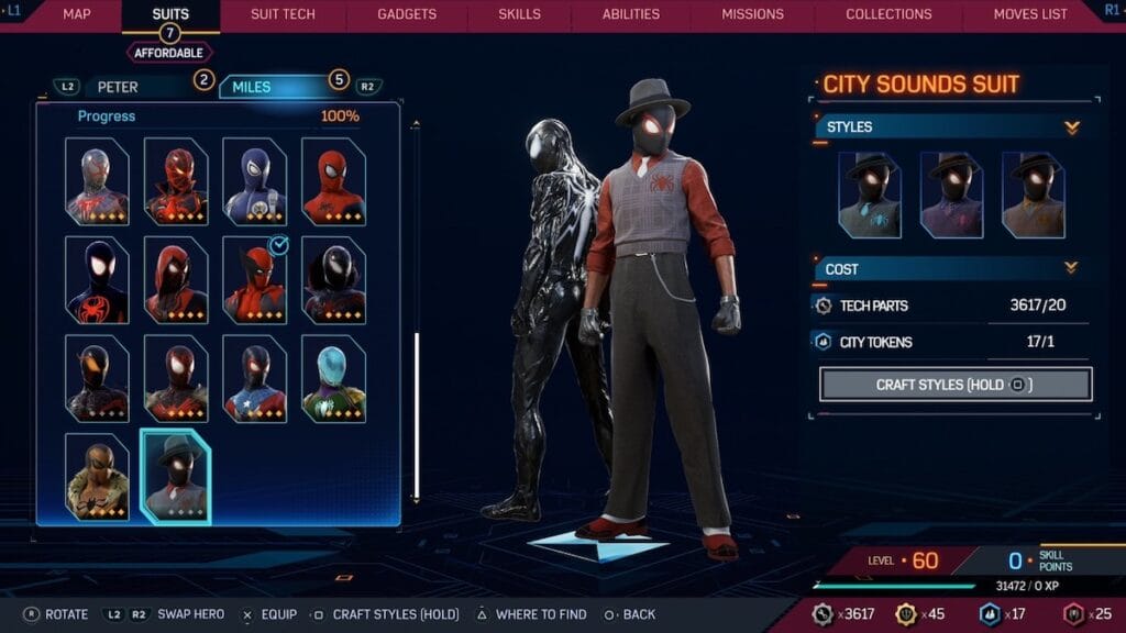 The City Sounds suit for Miles is a fun suit that absolutely embraces some of the more ridiculous suits the wall crawler has worn in the comics. This suit feels like Miles dressed as a 1920s mobster, complete with rolled sleeves and a pocket chain. The addition of a hat on top of his masked head is quite amusing as well. If you are looking for cool, this isn’t the suit for you and there is a decent chance that wearing this could really take you out of the experience, but its certainly fun.