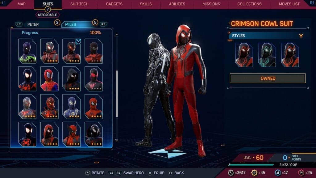 The Crimson Cowl suit is the best of the many red and black focused suits in the game. The red takes over as the primary suit color here, with the Crimson really popping. The black works to accent the suit well, especially on Miles arms. You get the classic Miles mask, with a red hood over it and a bit of the old suit poking out of the chest. This suit also has an excellent black spider logo, completing the Spider-Man look.