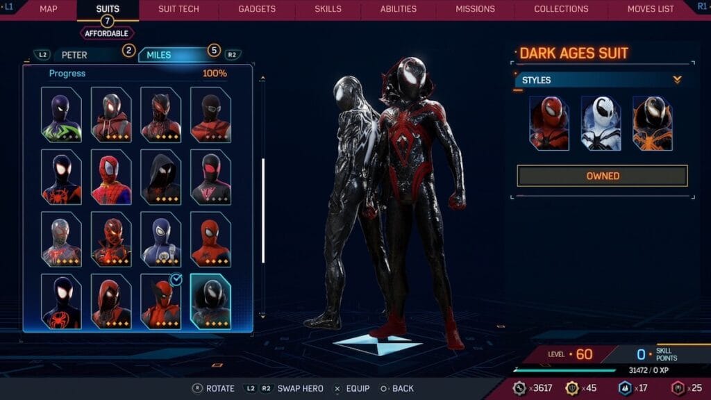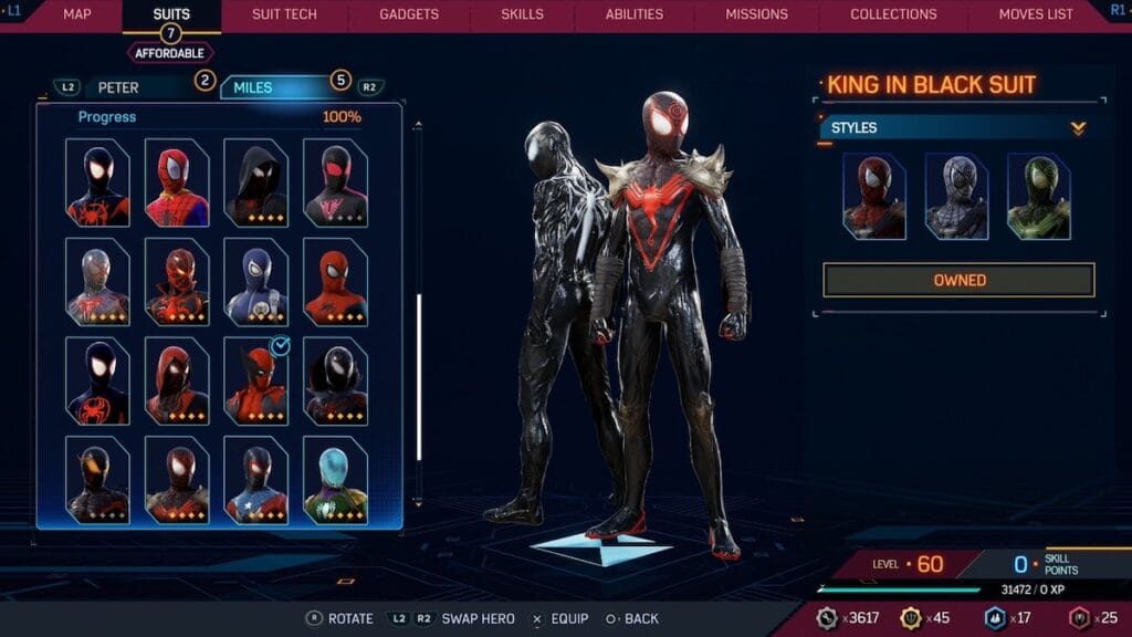 The King In Black suit is similar to Miles default suit, will a Knull inspired design. Knull is the head honcho of Symbiotes in the Spider-Man comics and his logo is imprinted on the chest of this suit. This one is eerily similar to the Dark Ages suit and not the nest Symbiote Miles suit, but it does have some interesting flourishes, like the pointed shoulder pads and wrapped forearms.