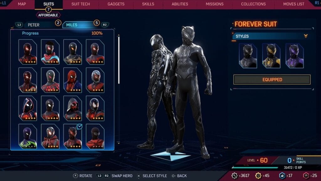 The Forever suit for Miles is an homage to Black Panther, which on its face is great, but a few odd design choices holds this suit back. The choice to have a hybrid between the Black Panther mask eyes and the Spider-Man mask eyes creates these elongated eyes that look strange and the stomach area of this suit has a bloated look to it. The all black design matches Black Panther, but considering the focus on black suit Peter in this game, it feels a bit bland, although some of the optional styles add a bit more flair.