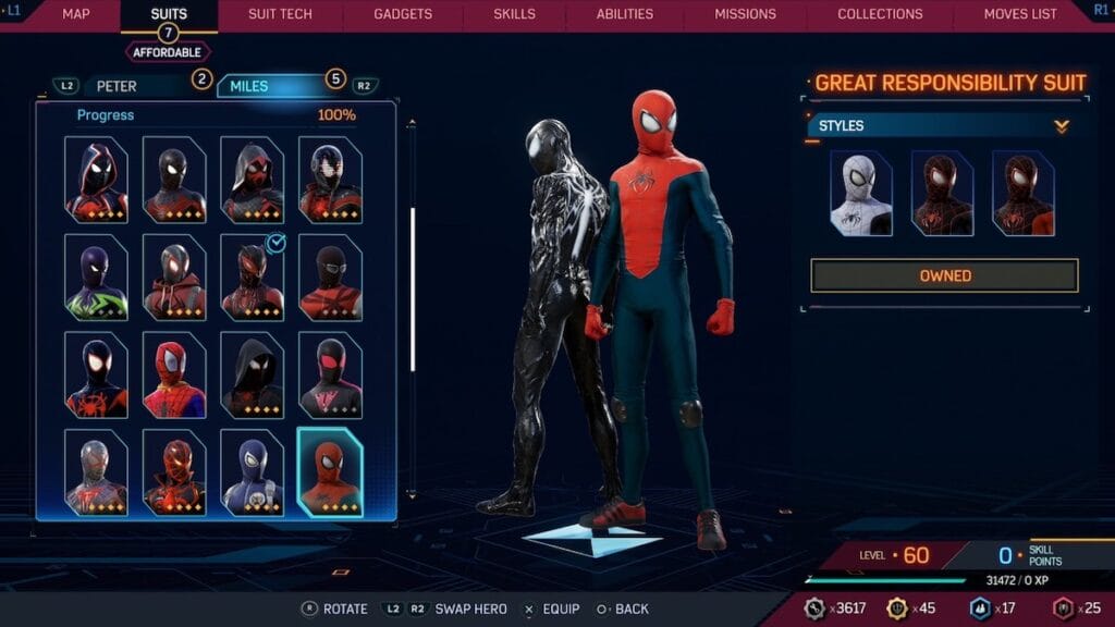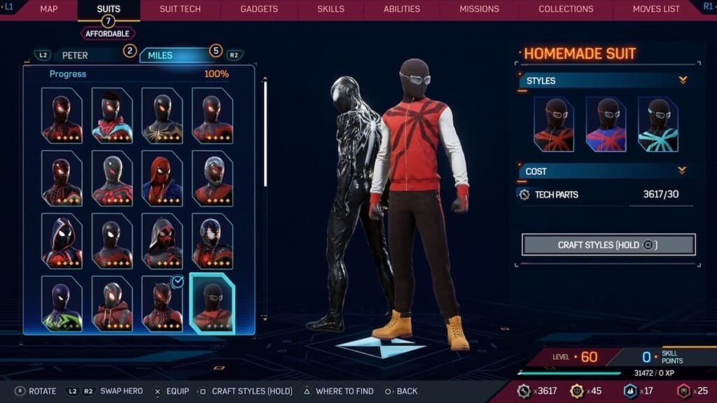The Homemade suit is a slightly better version of the Great Responsibility suit, in the sense that it’s supposed to be a first suit for Miles. This one works better since it feels much more like Miles suit, especially with the work boots. That said, unless you are interested in role-playing as an inexperienced Miles in Spider-Man 2, this suit is visually appealing, especially when compared to many other options on this list.