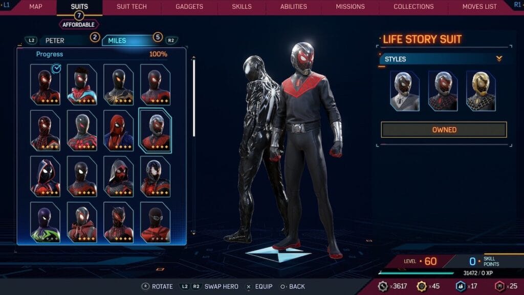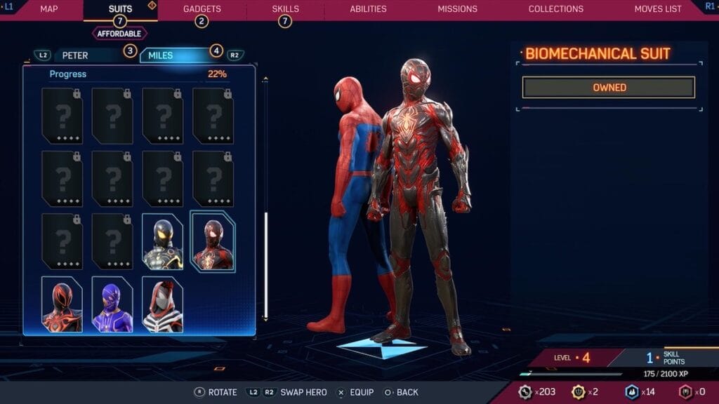 Perhaps one of the ugliest suits in the game, Miles’ Life Story suit looks like a bad Ant-Man cosplay. The mask inside the helmet looks ridiculous, the metal braces and weird belt don’t feel like Spider-Man. The whole thing looks stiff, which is not how anyone should be describing Spider-Man. The spider logo looks like a strange necktie, the whole thing is pretty off putting. There aren’t many suits in this game that are straight up bad, but the Life Story suit is.