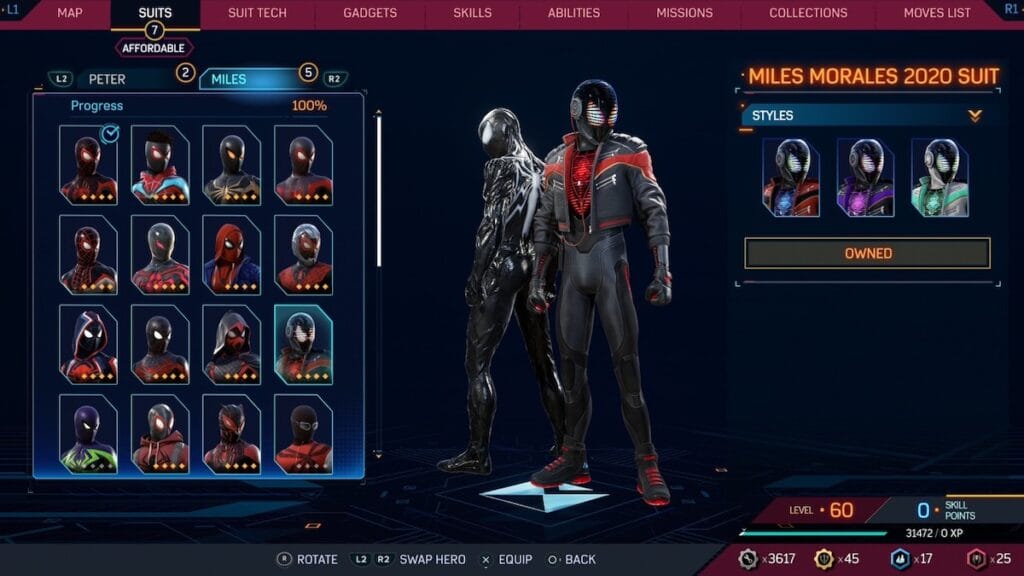 One of the coolest suits from Spider-Man: Miles Morales, Miles Morales 2020 makes its return. This suit features a Daft Punk style helmet, complete with headphones and a digital face. It also has a pretty sleek leather jacket with a red and black design, complete with a good looking suit underneath. The only thing going against this suit is how prominent it was in the previous game, taking away from some of its allure.