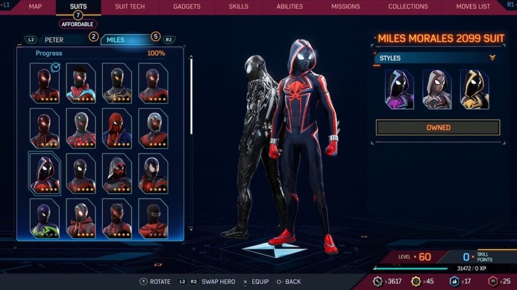 The Miles Morales 2099 suit perfectly blends the classic Miles suit and the 2099 suit. It adds blue to the suit but uses it for accents instead of making it the main color. It adds the small spike to his forearms and introduces a hood that feels right at home. This doesn’t feel like Miles wearing another Spider-Man’s suit but makes it his own.