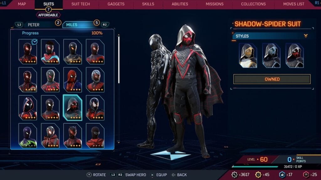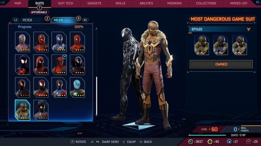 Another cosplay suit for Miles, this time inspired by one of the villains of Spider-Man 2, Kraven the Hunter. This suit features his fur coat and hunting pants, along with a gold and leather color scheme, all of which looks great as a Spider-Man suit. It’s obviously a little strange to play as Miles dressed as a different character, especially one in the game, but it does look good. The only downside to this suit is that there is one other cosplay suit that is almost perfect.