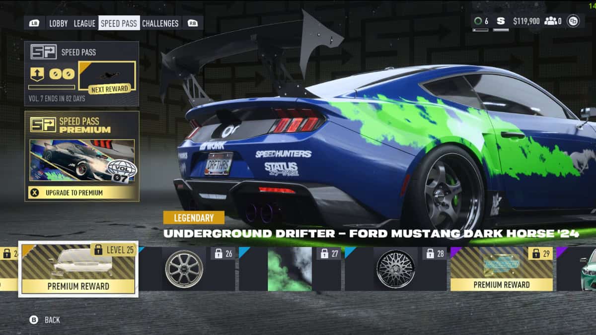 - Level 25: Underground Drifter – Ford Mustang Dark Horse (Premium Reward)