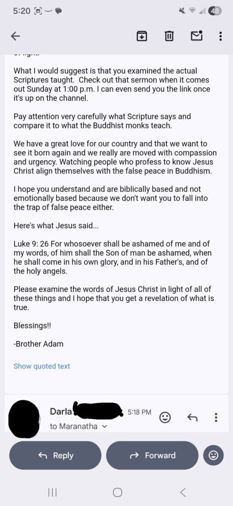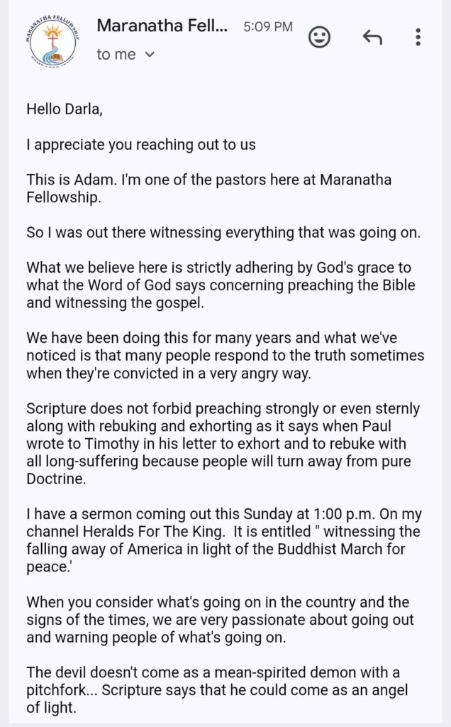 Rather than taking her criticism to heart, the Georgia pastors doubled down in their replies. Adam wrote, “We have been doing this for many years and what we’ve noticed is that many people respond to the truth sometimes when they’re convicted in an angry way.” He went on to claim that scripture doesn’t forbid “preaching strongly or even sternly” and revealed their fixation on the monks’ Walk for Peace by sharing the title of an upcoming sermon: “Witnessing the falling away of America in light of the Buddhist March for peace.”