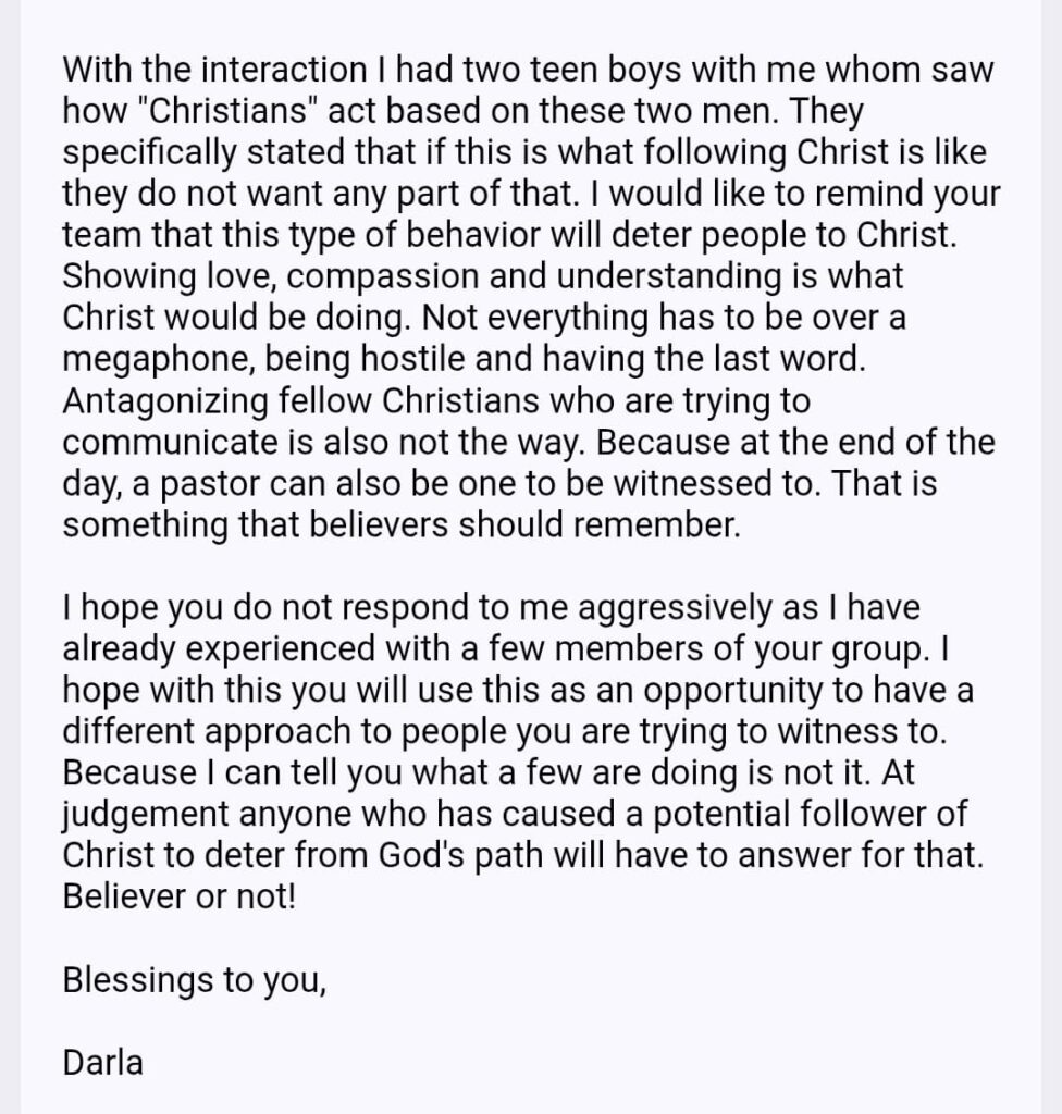 In response to Adam’s claim that aggression is the proper way to spread the gospel, Darla recounted an incident she witnessed. “With the interaction I had two teen boys with me whom saw how ‘Christians’ act based on these two men. They specifically stated that if this is what following Christ is like they do not want any part of that. I would like to remind your team that this type of behavior will deter people to Christ,” she wrote. The behavior of these pastors toward a group of monks promoting peace is deeply embarrassing.