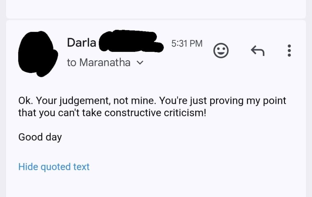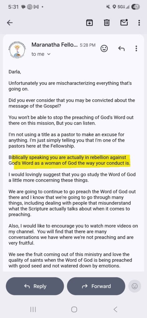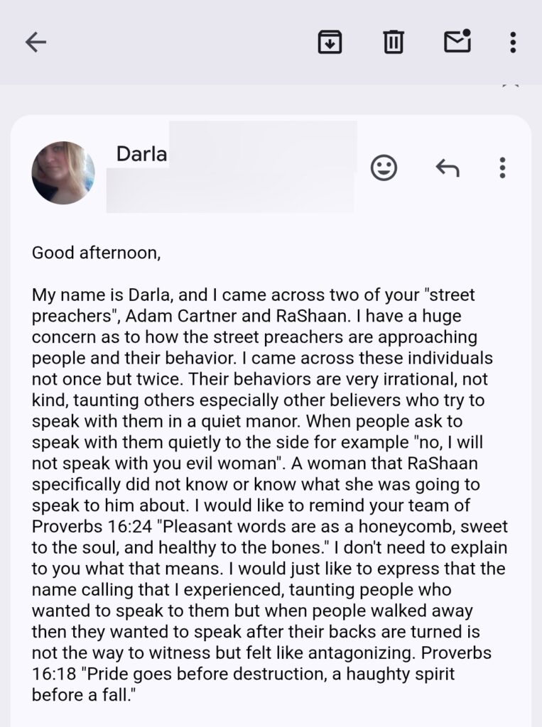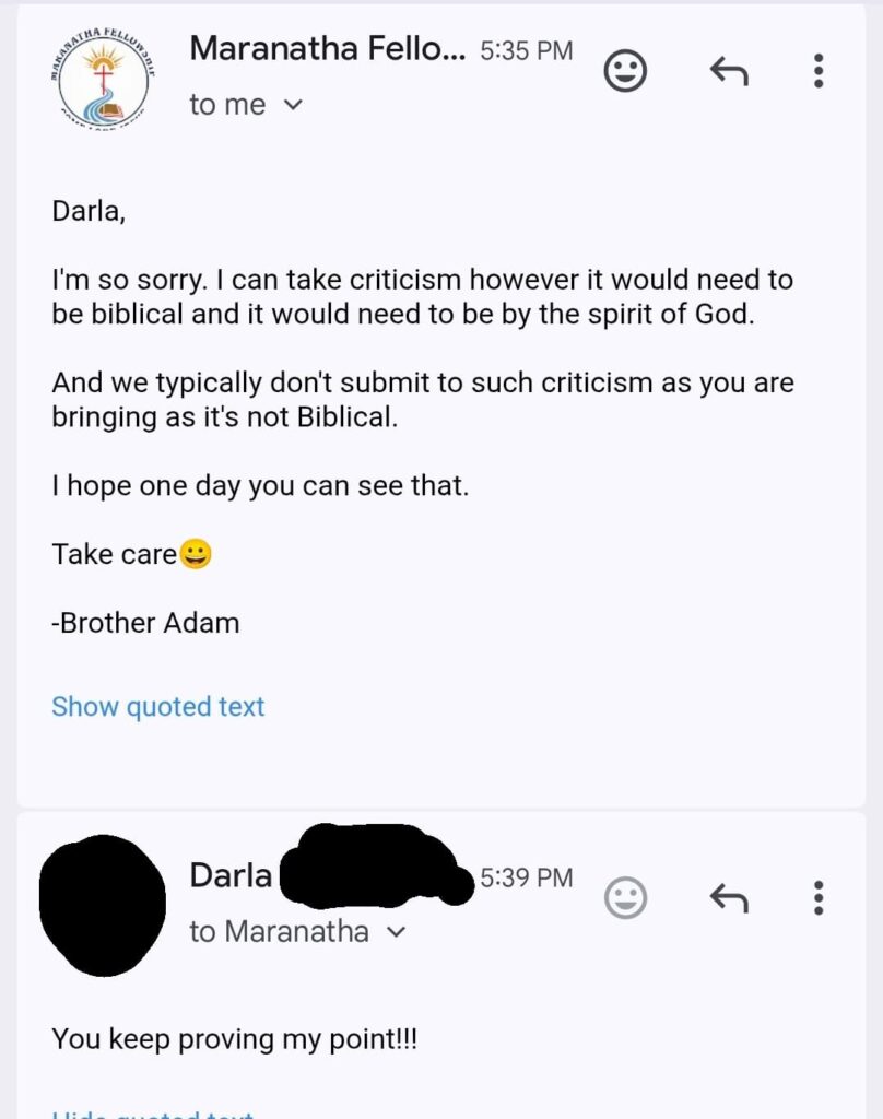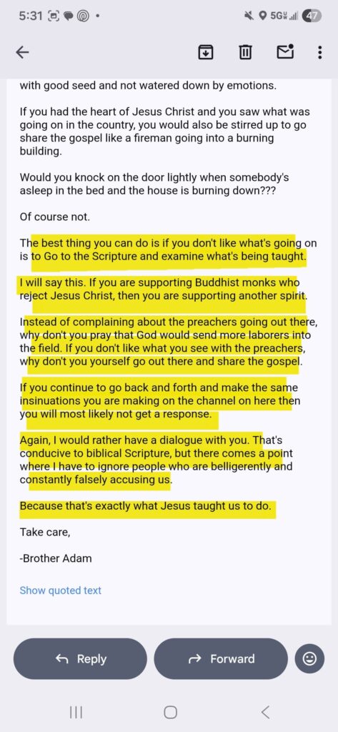 The hostility continued when Adam addressed Darla, who was merely offering advice. He claimed, “Biblically speaking you are actually in rebellion against God’s Word as a woman of God the way your conduct is.” He wrote this even though Darla’s only suggestion was that they share the gospel more kindly. He further questioned her faith, stating, “I will say this. If you are supporting Buddhist monks who reject Jesus Christ, then you are supporting another spirit.”