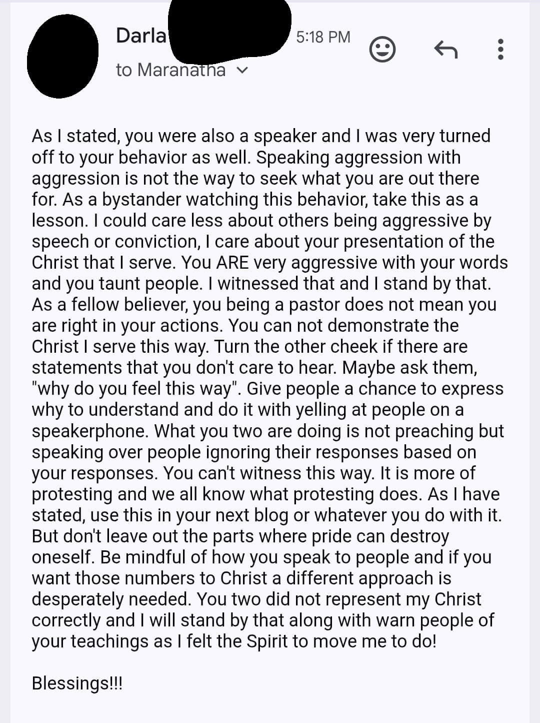 Reactions to the original story included Christians emphasizing that these men do not represent the faith, a sentiment Darla shares. She attempted to guide the men by contacting them to express how aggressive their behavior was. Instead, she encountered the same hostility the “pastors” had shown toward the monks. In her first email to the group, she addressed how they treated anyone who tried to reason with them. One pastor responded to her with, “No, I will not speak to you, evil woman.”