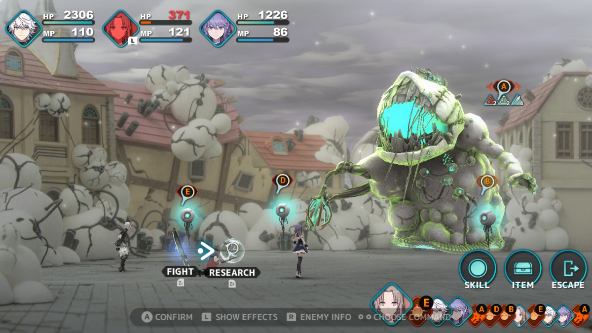 First, let’s talk about the actual hands-on moments during a fight. Since it’s turn-based, you have the usual elements: MP and HP bars, skills that you unlock as you level up, an item menu, and a timeline that shows which characters go next during combat. However, the gimmick here relies on the tactical element. Each attack has a line that shows where your move will land. Usually, enemies spawn in different formations. Some in a line, some in a cluster, and some as spread out as possible. It’s up to you to line up your shots, spells, and slices to defeat your foes effectively. However, there are more tactical elements that let you overcome even the most mundane fight.