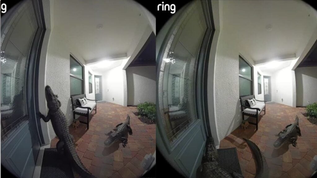 In the video shared by the Florida man, you can see a video taken by a Ring Camera. One of the two alligators stood up on the door (I don’t know how he managed to do this) before he went down again. The other alligator standing behind him looked like he had no functioning brain cells with the way he was standing there doing nothing. After the first time, the first alligator crawls to another wall and climbs it as well before falling to the ground. It seems that this one doesn’t have any brain cells as well because he hit his head against a chair when he fell. Thankfully, the Florida man had the Ring camera. I can’t imagine what would have happened if he had opened the door.
