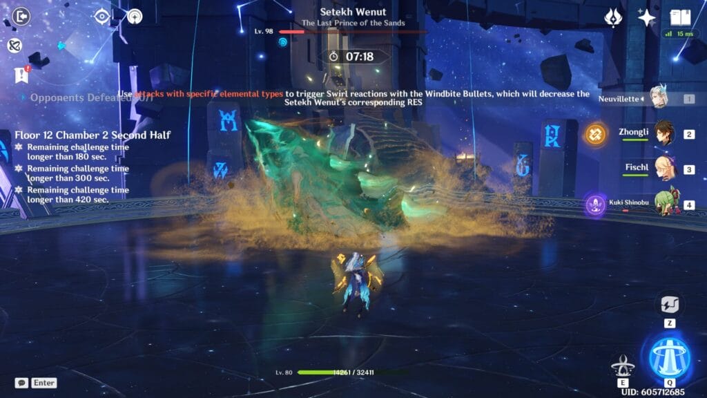 This half of the Spiral Abyss features the Setekh Wenut boss. If the Ruin Serpent irritated you with its invulnerability phases, the Setekh Wenut is even worse, spending the majority of its time ducking and weaving underground. Using characters like Neuvillette and Yoimiya is extremely useful here, as their damage rotations are quick and can quickly deal damage while the boss is above ground.