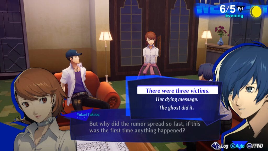 During May and June, you will hear various ghost stories that become popular in Gekkoukan High School. Although it is unlikely to be real, SEES decides to get to the bottom of this rumor. You are tasked to perform a ghost investigation where you must ask various students in your school. On June 5, you will have a short meeting where Yukari will ask you about the answers behind these ghost stories inĀ Persona 3 Reload.