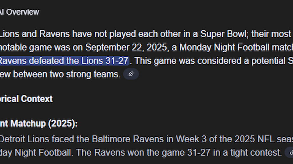 As you can see from what I bolded, it has the Ravens beating the Lions in a closely contested matchup. Couldn’t help but laugh, as one of the most common complaints about Google’s use of AI, outside the whole, steal everybody’s ideas and then end their business thing they got going on, is the fact that it can be so utterly wrong on what it claims to know and state as fact.