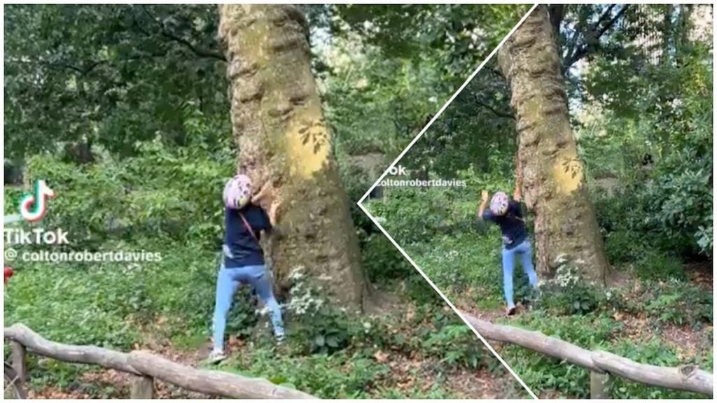Sporting a navy T-shirt and blue jeans, the woman is seen standing at the base of a large tree, tossing acorns up toward the branches above. At first, it’s unclear what she’s doing, but as the camera pans upward, the reason quickly becomes clear. Nestled in one of the tree’s knots above, a small gray squirrel can be seen trying to catch the acorns the woman is tossing up to it.