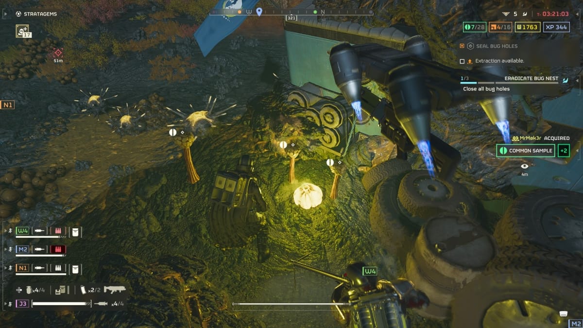 The cooperative part is the best executed I have seen in years. With everything happening in real-time and waves of enemies coming at your position, it all leads to how well the players can work as a team. The on-the-fly decision-making is so entertaining that you must adapt to what others are doing. Maybe you’re entering codes at a terminal, and your teammate calls in a napalm attack near you; you have to adapt. A teammate of yours died? You must call in another Helldiver instantly while dodging lasers and acidic spit. It’s a strategic game that simulates an intergalactic war flawlessly, and anyone can join it.
