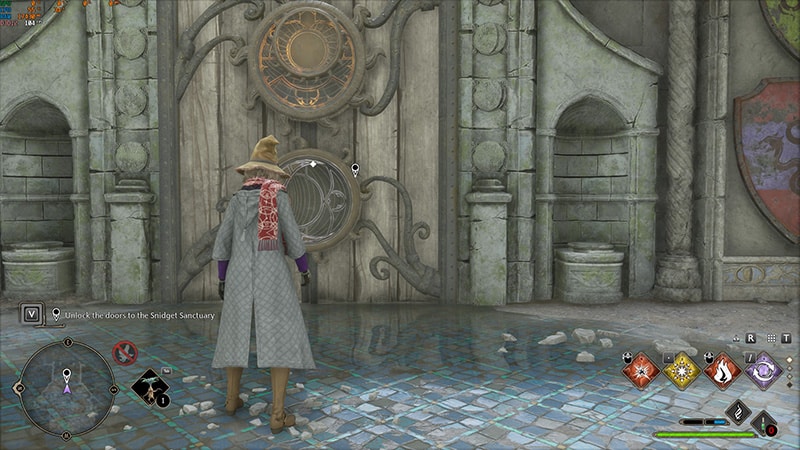 Follow the quest marker, destroying blocked paths with incendiary and Bombarda until you come across a locked door with two circles on the ground in front of it.