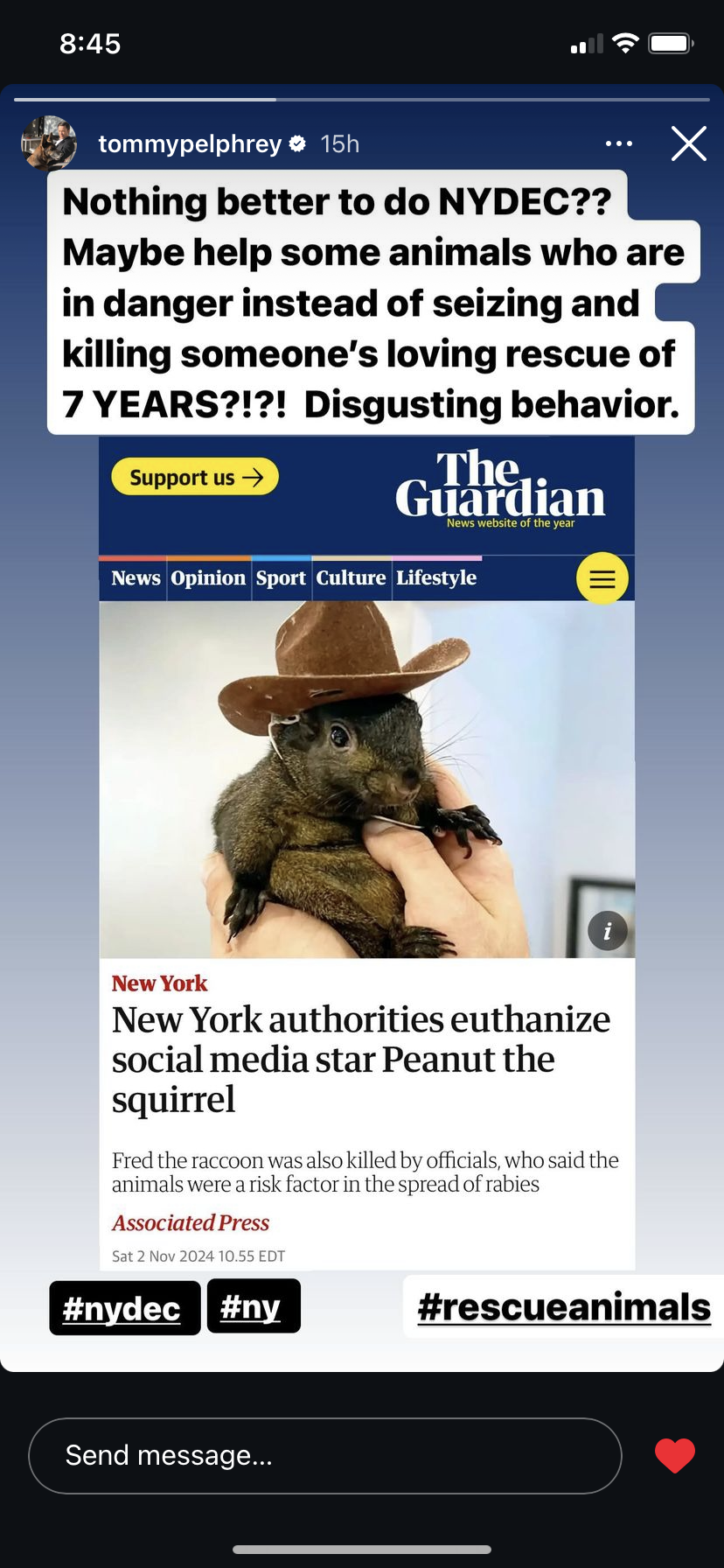 Peanut’s death has become a topic of outrage and controversy. On October 30th, the New York State Department of Environmental Conservation ascended on Longo’s home amid complaints of illegal possession of wild animals and rabies concerns. Authorities raided Longo’s house for five hours before capturing Peanut and his brother Fred the Raccoon. Both animals were later euthanized after one officer was bitten during a scuffle.