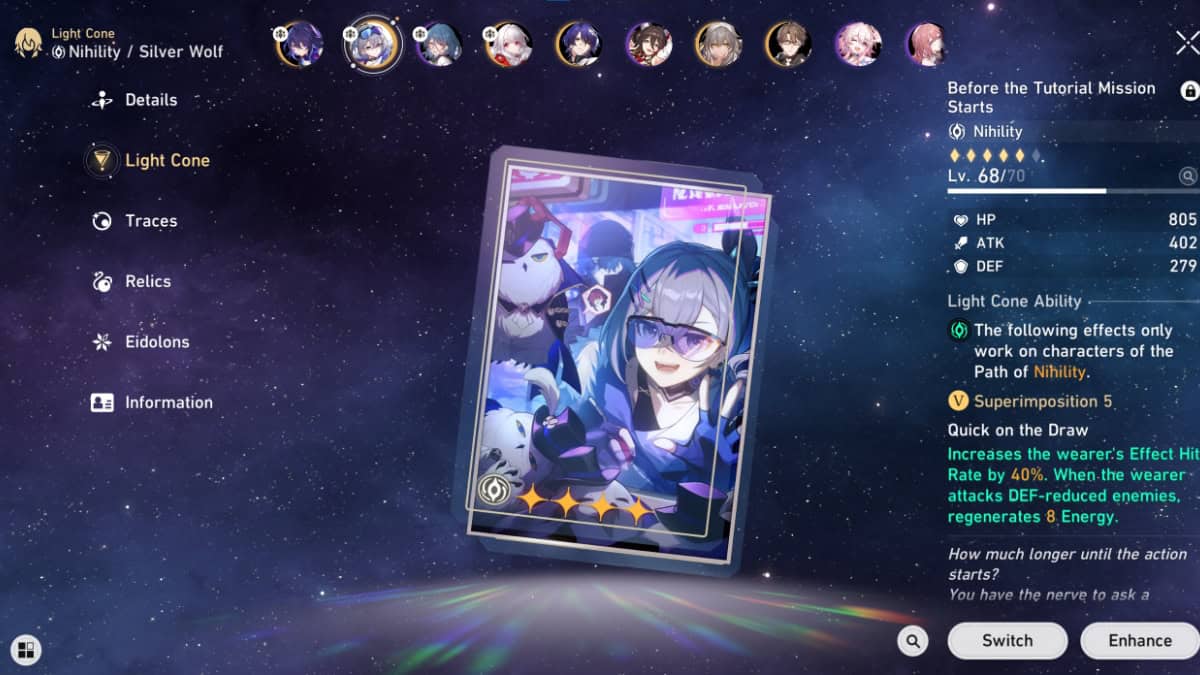 Silver Wolf is, after all, a debuff character, and stacking up as much Effect Hit Rate as you can is paramount to her performance. As a goal, an Effect Hit Rate of 96% or higher is ideal for the endgame content in Honkai: Star Rail. This ensures that Silver Wolf’s debuffs will always land and will make your mono-element team viable.