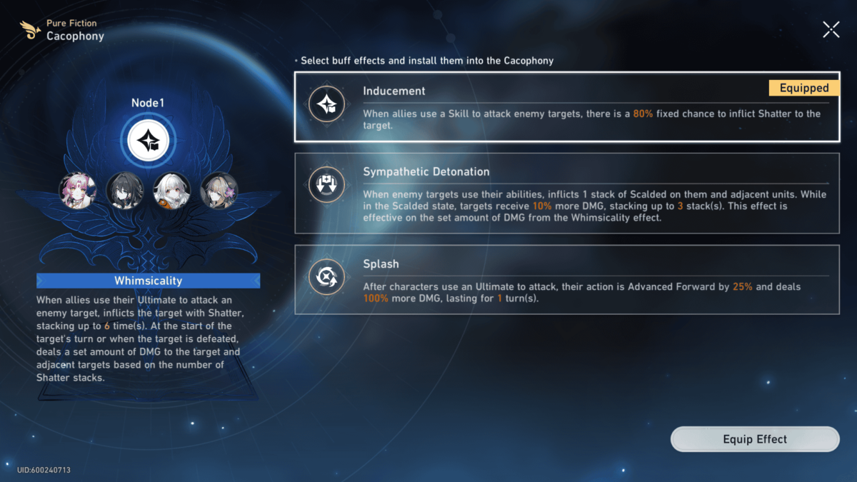 In addition to the “Whimsicality Effect,” Pure Fiction provides both of your teams an additional “Cacophony Buff.” This is a second buff that stacks with the Whimsicality Effect. Each Pure Fiction rotation has three buffs you can choose from. We recommend the Inducement buff, as this increases the amount of Shatter the enemies receive which better increases your damage.