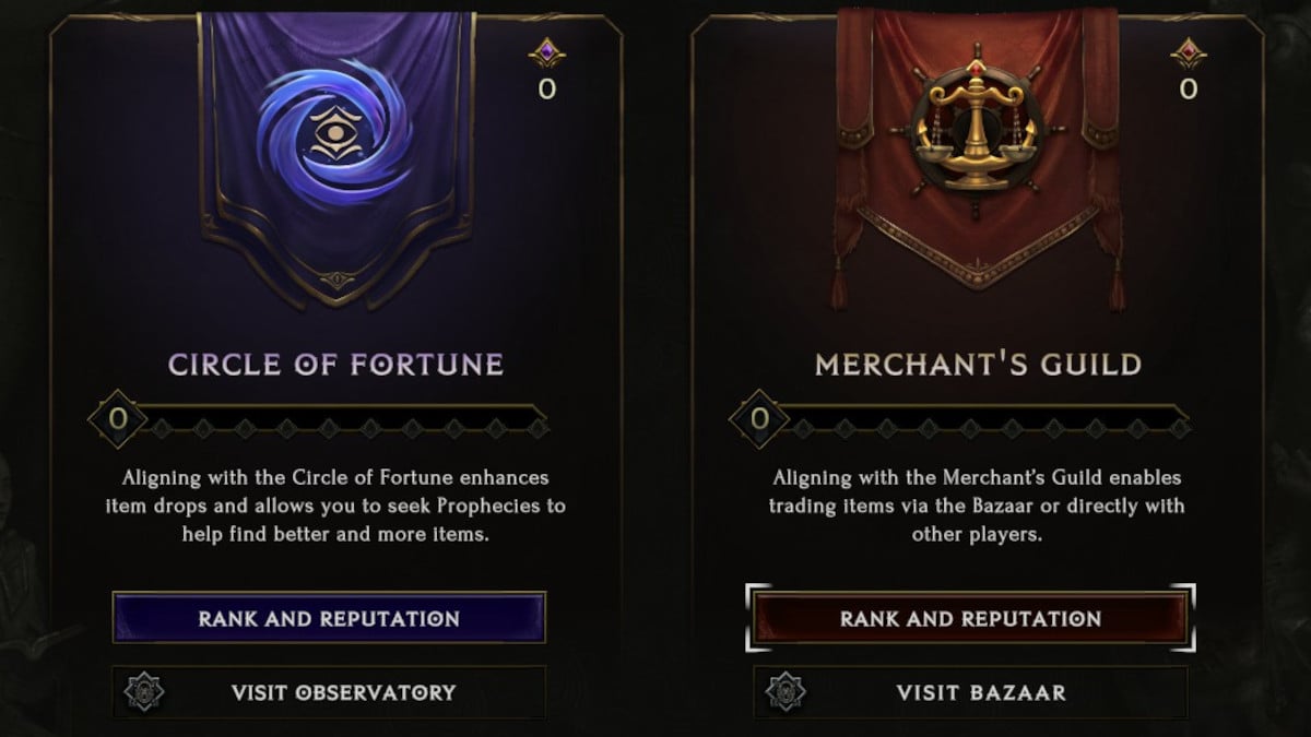 The Merchant Guild allows you to trade with fellow player members at the Bazaar, or in any town as long as you’re both there in Last Epoch. Any items acquired can be equipped or used while aligned with the Merchant’s Guild. This means that any items acquired while aligned with Circle of Fortune won’t work if aligned with the Merchant’s Guild. But while I’m talking about Circle of Fortune, we should examine the two guilds’ differences.