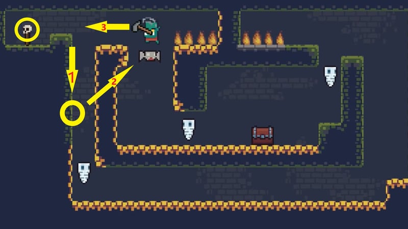 First, it is worth disassembling the level into its parts to understand what you must do. At first glance, you have two ways in which you can get to the chest. The first path is in front of you, and you only need to jump down after throwing an ax at the skull. Going down, you will be able to go halfway, but after, you have to return the ax to yourself. After that, the ghosts will become tangible again, and you will be trapped.