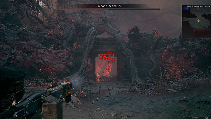 Standing in the clearing, shoot at the Root Nexus from a distance to start. Once the first wave of spiked foes starts rolling in a literal sense, use your guns to take them down. Melee attacks will risk you getting struck and losing HP, which should be preserved for later waves. The teleporting archers should also be slain with range firepower, as they can retaliate with a melee strike if you get too close. Once the initial wave is over, melee-flail away at the Root Nexus until the next round begins.