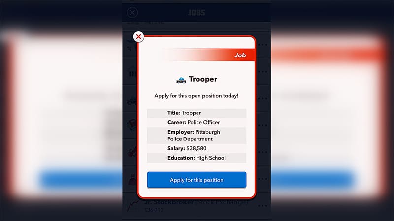Once you meet these conditions, you can start your job search as a Police Officer at BitLife. To do this, open the Occupation menu and look for a Cadet, Patrolman, or Trooper job. There is a police car icon next to it, so you can’t go wrong. And you have to work hard to get promoted and become a Police Officer in BitLife.