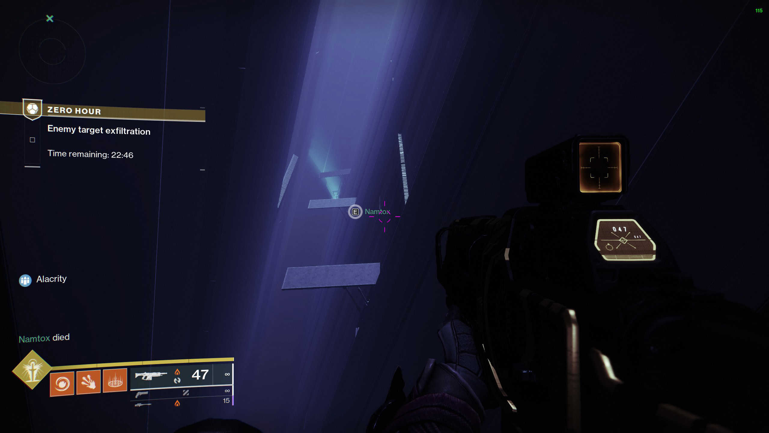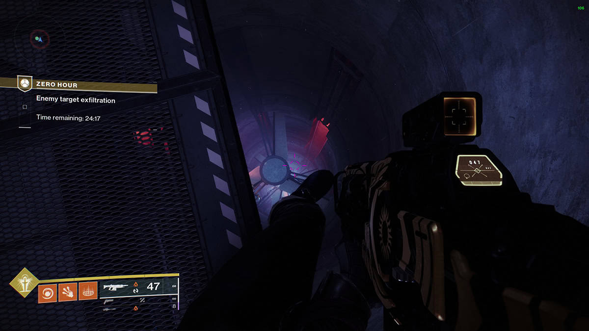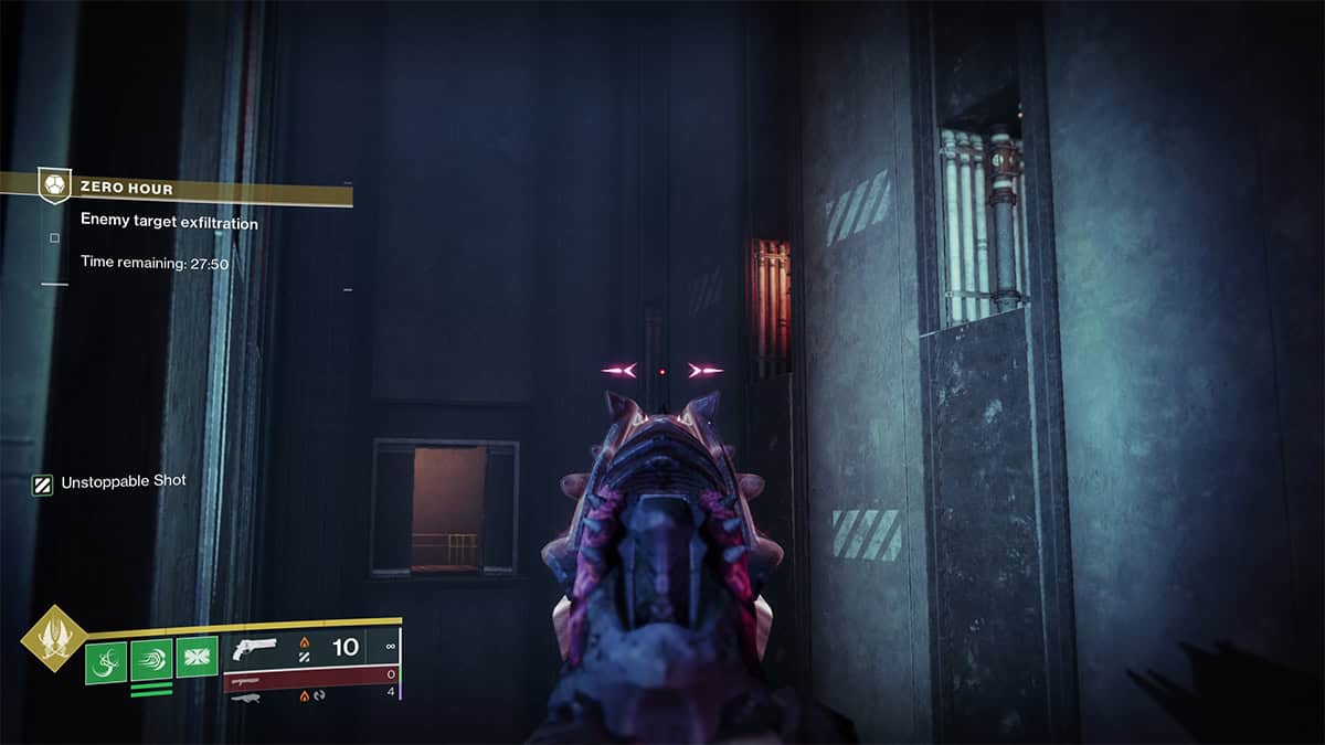 As you continue on to the next area, you’ll come to a few ledges that you can jump down to different platforms, leading to the next area with more enemies to defeat until you have made it to a small vent hidden on the side of the building. Head through the vent and begin the platforming stage of the Zero Hour Exotic mission.