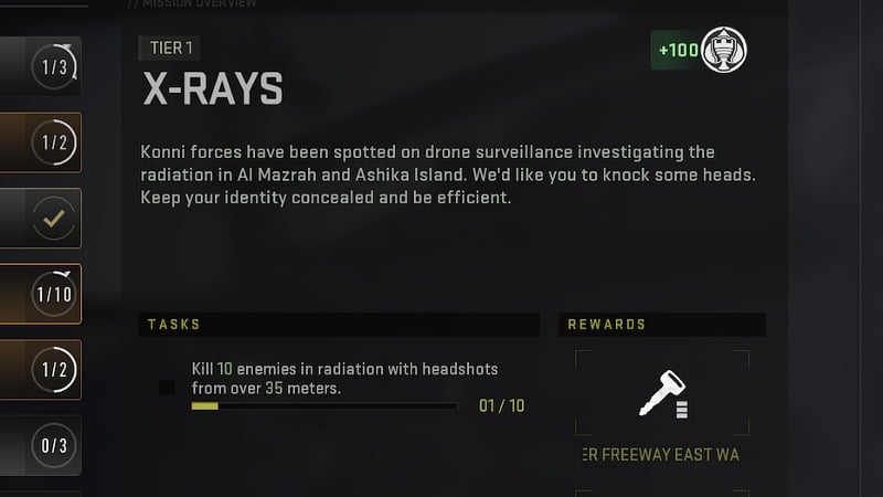 After you get 10 headshot kills from a 35m range in the radiation zone, your X-Rays DMZ mission will be complete. Finishing this assignment rewards you with a key and 5K worth of XP to progress in ranks and a Season 5 Battle Pass.
