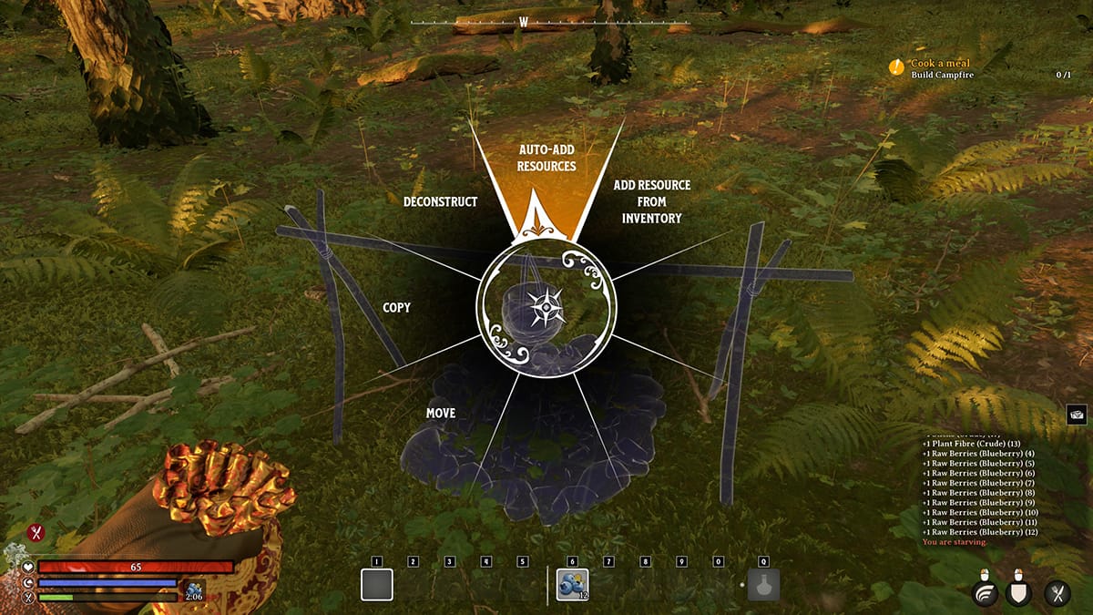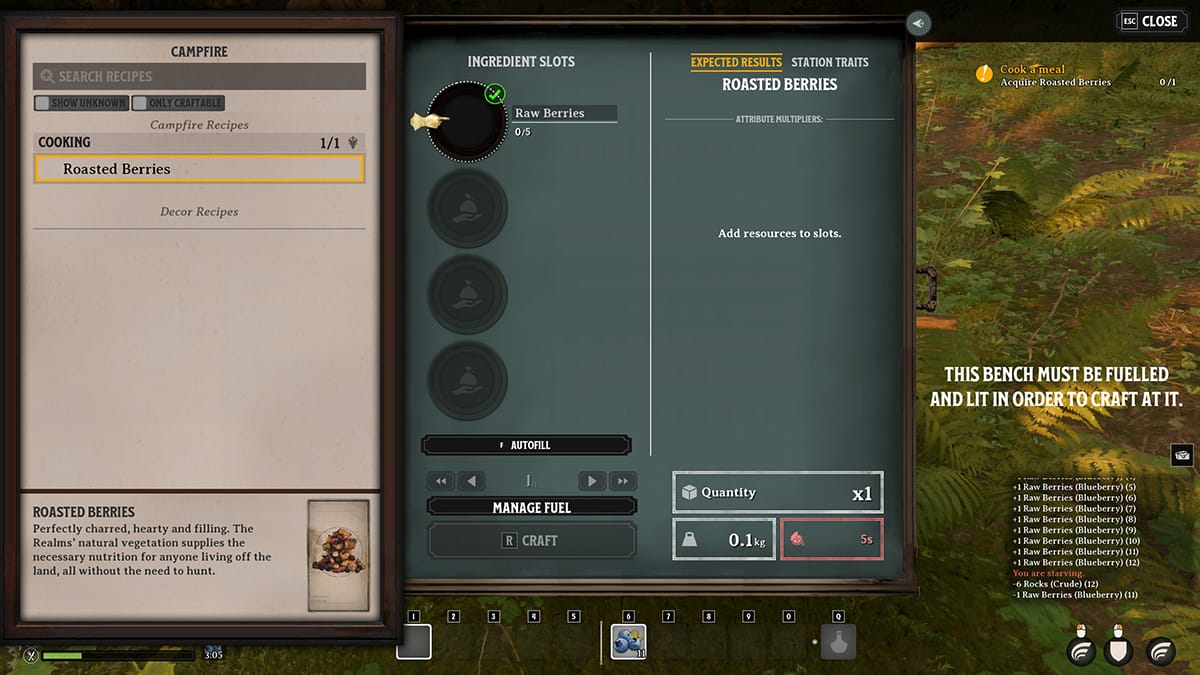 After you’ve got your Campfire up and running, it’s time to start cooking. You can see your recipes and required ingredients from the Campfire menu. Once you’ve got everything together, simply choose them, autofill the Campfire, and get to cooking.