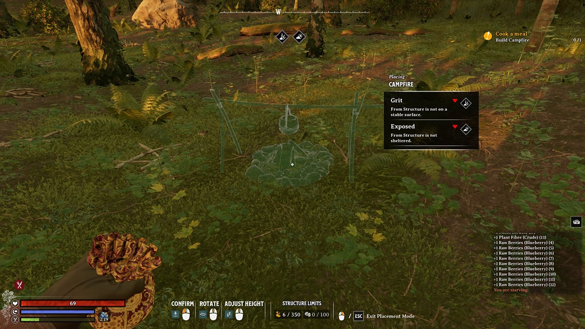 Collect a few Rocks off the ground, then head to the location where you want to set up your Campfire and hop back into the Building menu again. From here, select the Campfire, then press the Place button at the bottom of the Campfire information. Here, you will be able to place the Campfire down, and then begin adding materials to it to complete the building process.