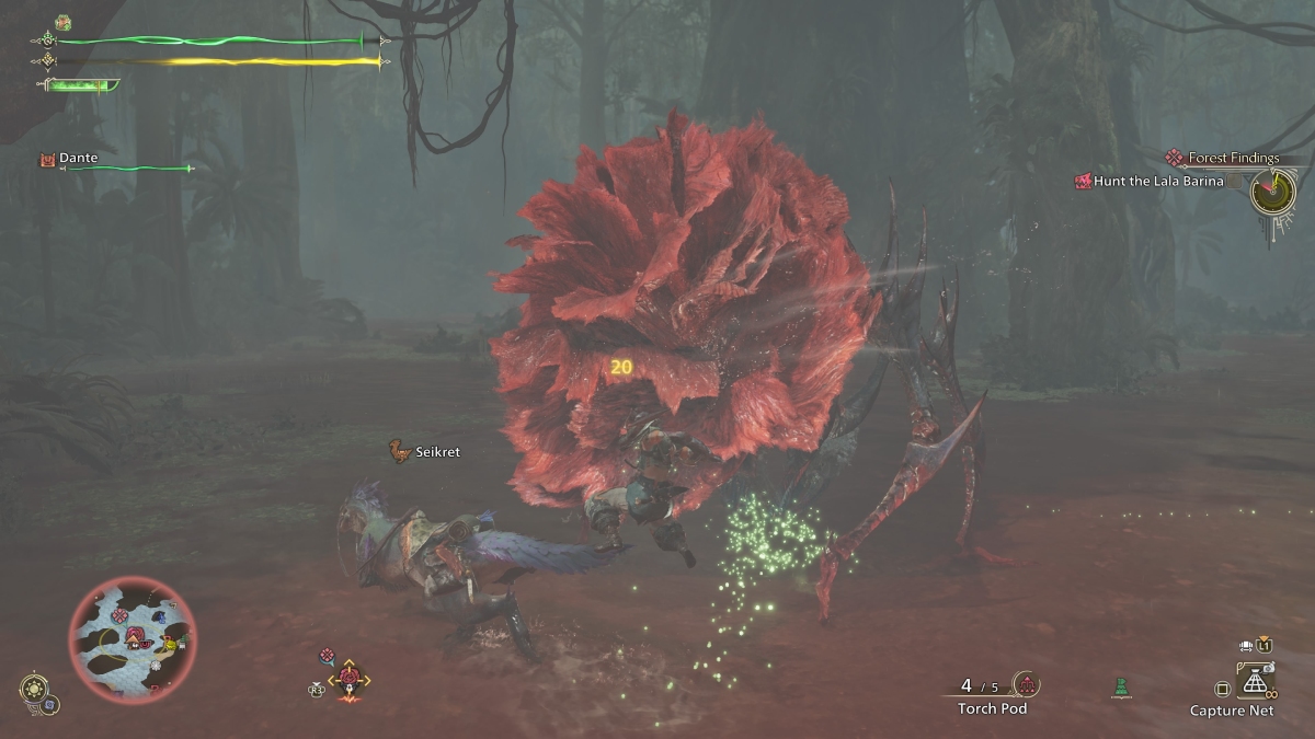 Once you have the above elements, weapons, and traps, it’s time to begin the hunt. Out of all early-game monsters, Lala Barina is one of the fastest in Monster Hunter Wilds. It can bounce around the battlefield, attack quickly with its legs, charge at you, and once it opens the flower on its back, it will leave flying flowers that can paralyze you, meaning your effective battle range won’t be as effective. For melee hunters, this isn’t so bad, but ranged fighters might have a harder time. In any case, this is the strategy you should follow: