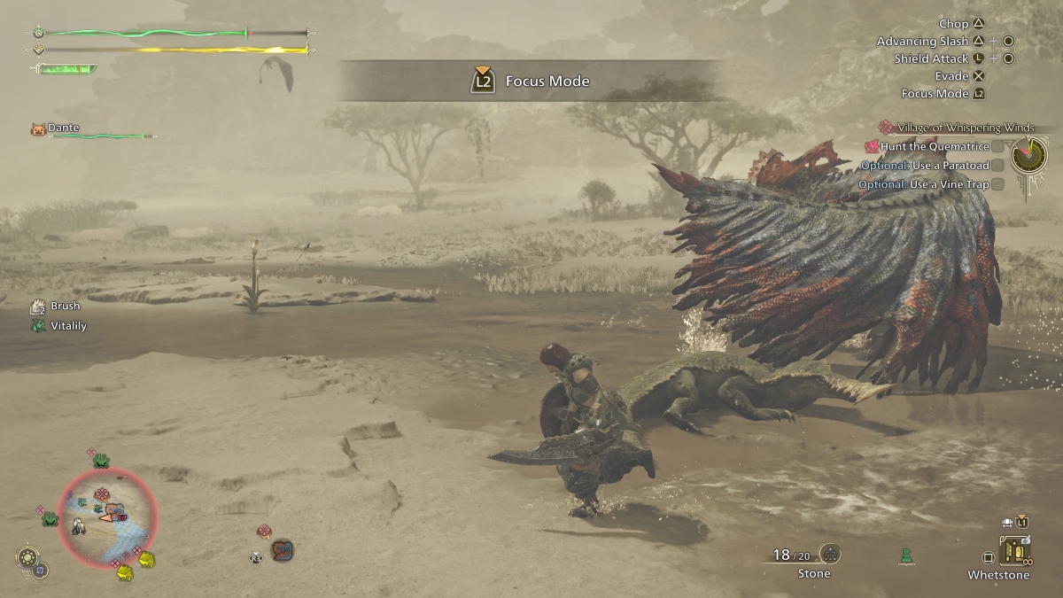 Alright, onto the important part: defeating your first Quematrice in Monster Hunter Wilds. If possible, try to start the fight with a sneak attack. Quematrice are lone beasts, and you can usually find one drinking water or roaming the Windward Plains. Sneaking behind them is quite easy, so make use of that. Once the fight begins, follow these steps: