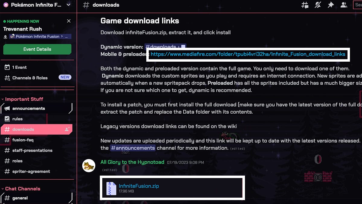 Playing Pokemon Infinite Fusion on PC is a straightforward process that involves downloading and extracting several files. However, the tricky part is knowing where to safely navigate to the download links without encountering harmful pages. To avoid such threats, we recommend using two sources: the official Discord or the Pokemon Infinite Fusion website.