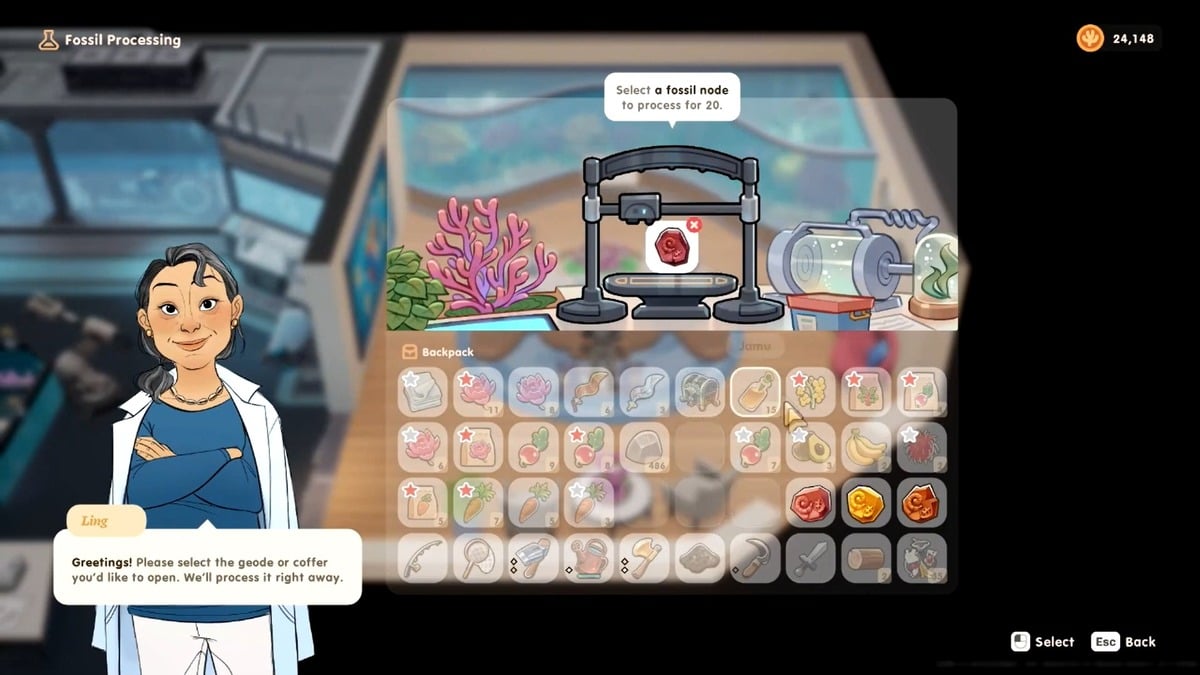 As we said, the only way to get Fossils in Coral Island is by processing the Fossil nodes. To do this, you only need to go to the city Laboratory and talk to Ling. During the conversation, select the Process Fossil Remains option and place your Fossil node in the cell, as shown in the image above.