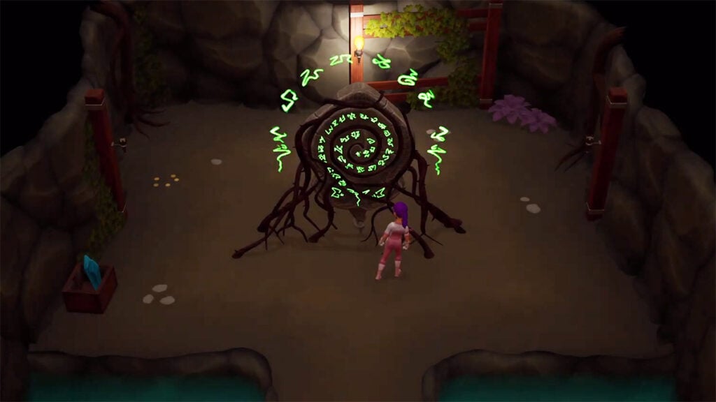 Finally, when you reach Level 40 of the Earth Shaft, you will find a large stone with green runes. Interact with it to remove the roots keeping it. After this, the Chieftain will appear and say that you have removed the curse from the Earth Giant in Coral Island. Use the elevator to go up to the Cavern entrance and meet your new Giant friend, Grog.