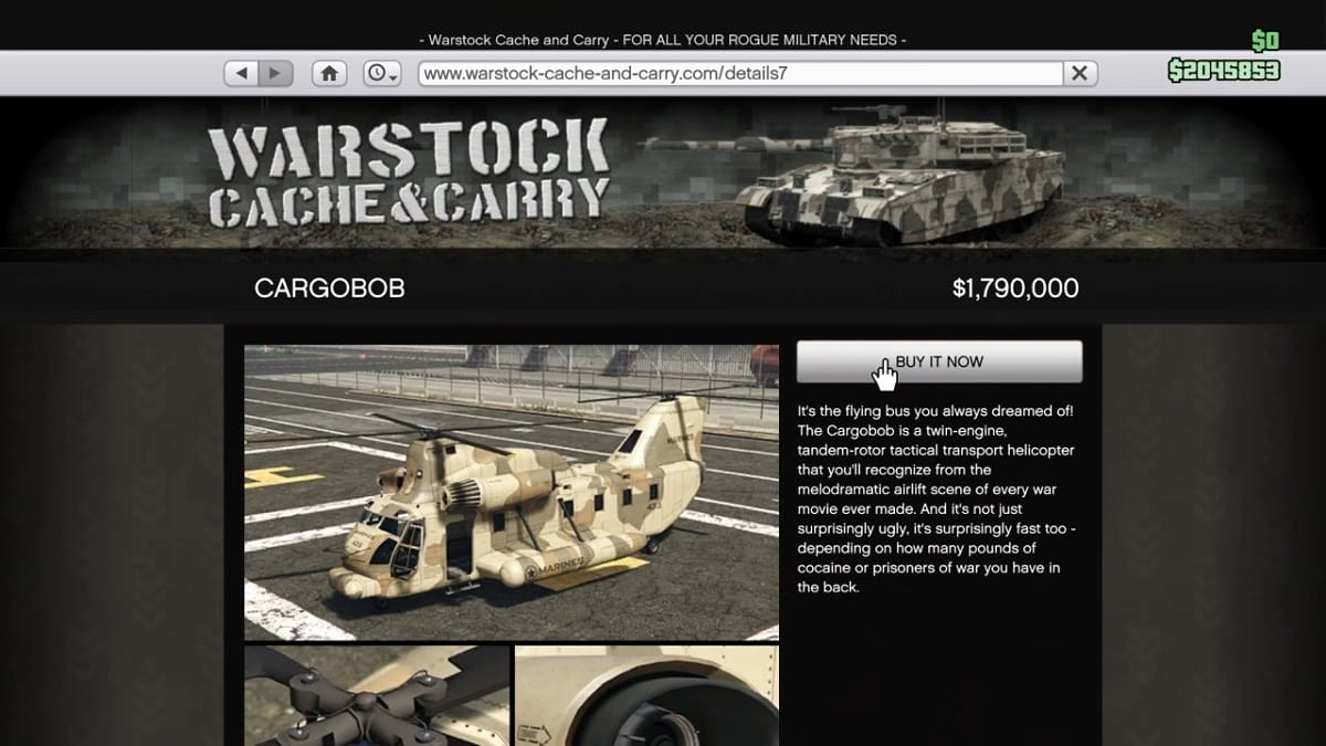 The problem with this method is that you may not find a Cargobob in any of these locations since its respawn is totally random. Therefore, there is a more certain but costly method you can use to get such a chopper.