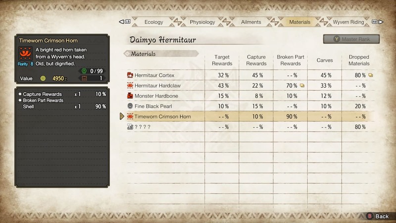 Once you get one or more Timeworn Crimson Horns, you can craft a good and rare Daimyo Hermitaur set. Despite its rustic appearance, this is a powerful piece of equipment it will help you in any further battles. Therefore, we advise you to try to get this set as quickly as possible despite the complexity of the task.