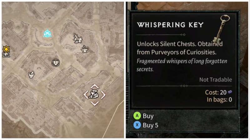 You can get Whispering Keys in Diablo IV by visiting the NPC Lizveth Purveyor of Curiosities. To do this, you must go to one of the starting cities – Kyovashad and the southeastern part of the city. Open the in-game map and look for the bank icon. Near a small wooden house, you will notice an unremarkable girl. After talking with her, you will see a lot of goods that she can sell you.