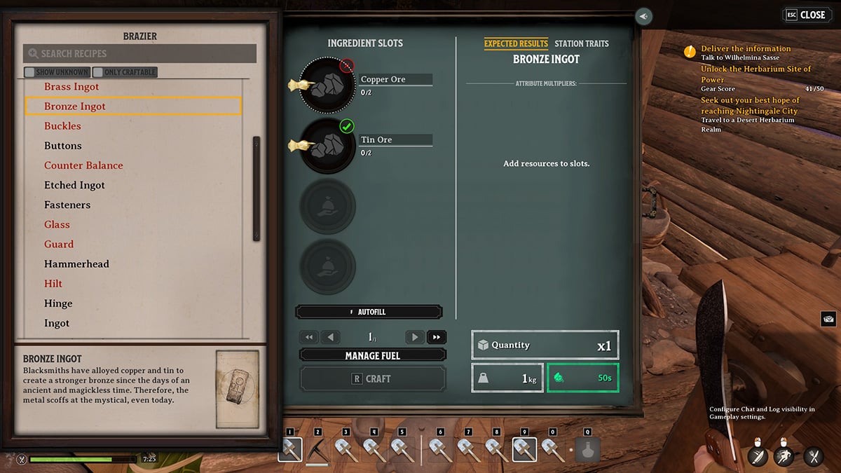- Using both Copper and Tin Ore, head over to a Brazier crafting station and begin to smelt down your ore into Bronze Ingots.