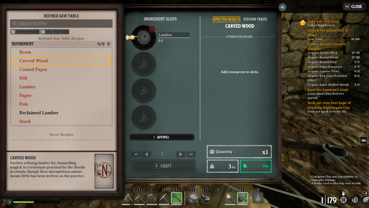 Once you have a Refined Saw Table, you can craft Carved Wood using Lumber 4x. Thankfully, Lumber only requires Wood Bundle x2 to craft, and you can get that by chopping down a single tree. Once you have the Lumber you need, return to the Refined Saw Table to craft the Carved Wood. This refined crafting material has the following Attribute Multipliers: