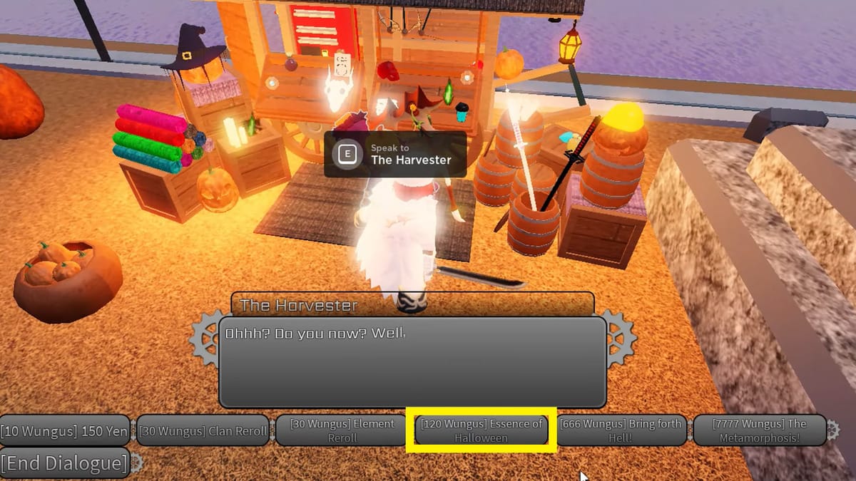 Once you have collected 120 Wungus, you can visit the event NPC and buy the desired item. Finding Harvester will not be difficult since this pumpkin-headed evil spirit has set up a stall by the river between the Ancient Temple and Graveyard.