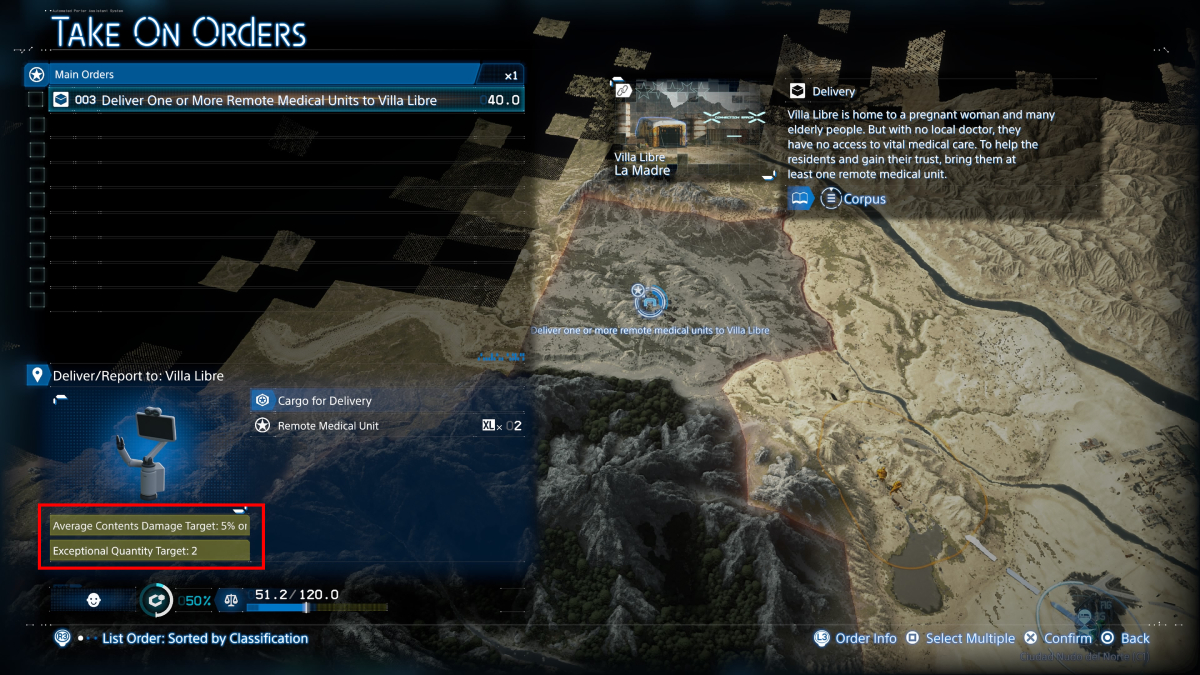 Once you complete the prologue and reach Ciudad Nudo del Norte, you’ll be able to take a new order that will show you its S Rank requirements. Remember that all orders have the requirements at the bottom left corner and highlighted in yellow. If you want to get the highest rank, you need to meet the conditions shown there. For instance, Main Order 3 tells you that the average content damage should be 5% or less, and the exceptional quantity target should be 2. If you meet those conditions, you’ll obtain S Rank.